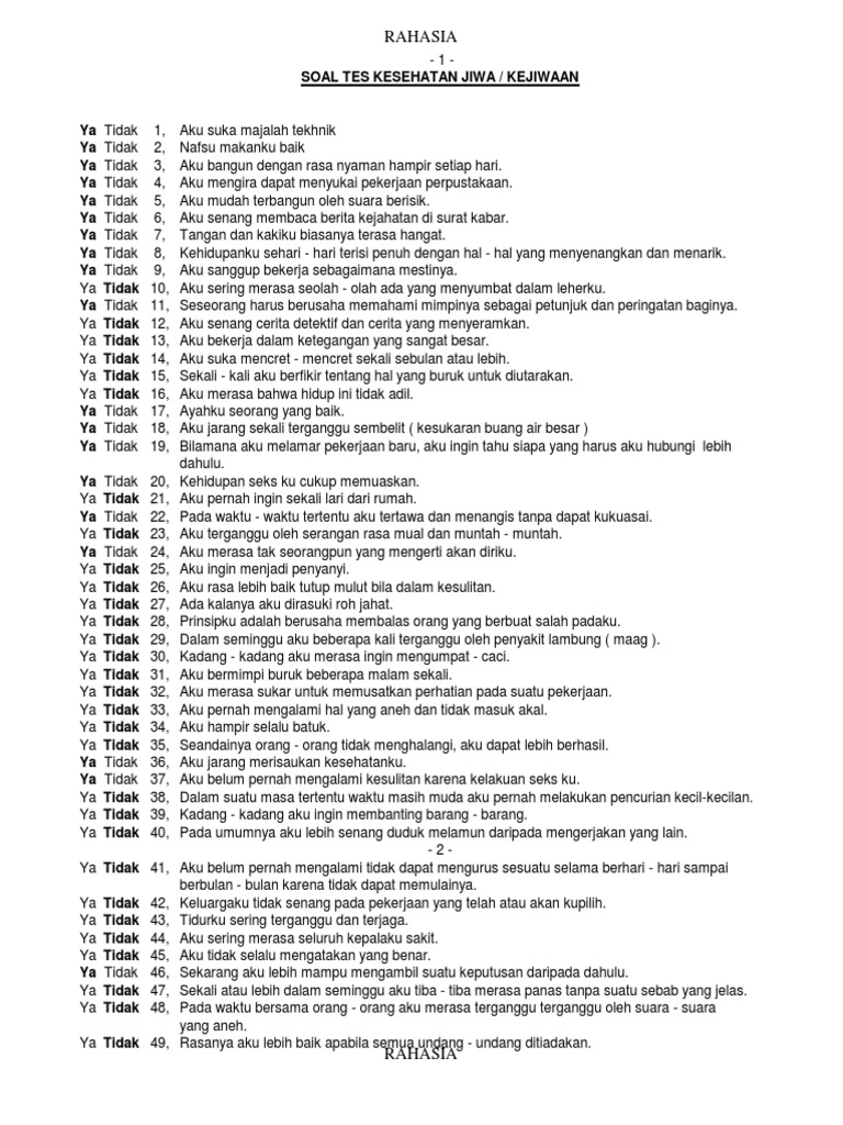 Kunci jawaban soal tes keswa ditulis berita hari ini 21 september 2019 april 13, 2020 daftar isi artikel. Pusat informasi pendaftaran bintara facebook. Kumpulan 567 soal tes psikometrik tes psikologi mmpi. Mar 28, 2020 · contoh soal tes kesehatan jiwa bagi calon bawaslu kpu dpr dan 319813294 soal keswa pdf rahasia 1soal tes kesehatan jiwa kunci jawaban soal tes keswa kunci jawabanku Tentang informasi trik tips tes kesehatan jiwa.