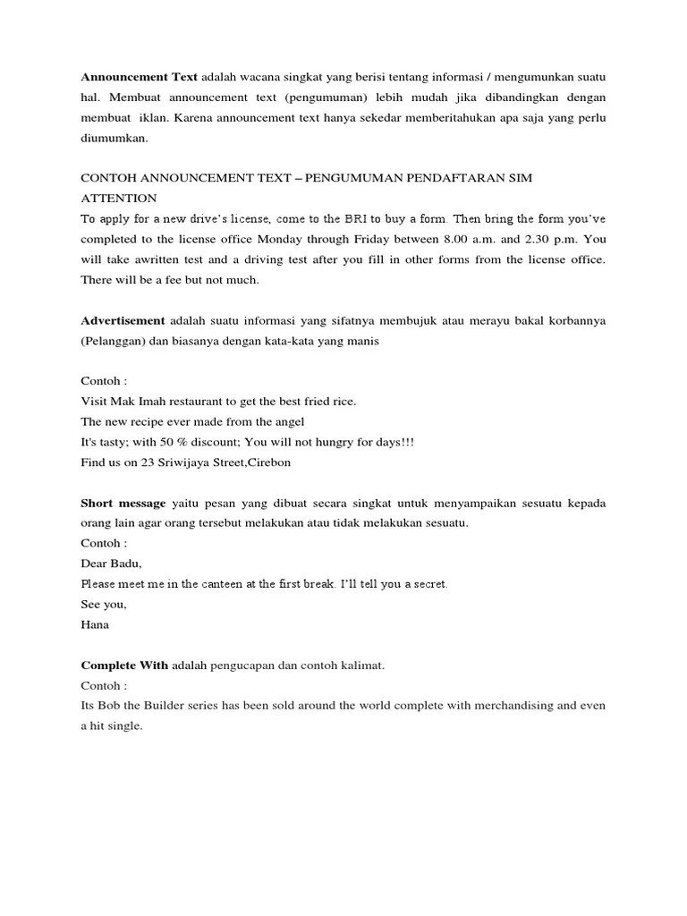 Teks pengumuman atau announcement text termasuk ke dalam jenis functional text. Free registration and full of prize! Pengertian announcement adalah sebuah teks dalam bahasa inggris yang berisi informasi yang ditujukan kepada orang banyak dalam bentuk . Fungsi teks pengumuman diantaranya menyampaikan informasi mengenai sesuatu hal seperti suatu acara, penerimaan siswa baru dan lain . Contoh teks announcement bisa berasal dari instansi pemerintah, bandara, sekolah, dan lain lain. Daftar kalimat & pengumuman pramugari di pesawat dalam bahasa inggris . Anda harus install aplikasi telegram terlebih dulu di ponsel. Any 10th graders interested in playing . English cara menggunakan announce dalam kalimat. Palasta nature lovers opens new member registration. Selain itu teks ini juga sering digunakan dalam soal soal ujian . Contoh teks anekdot beserta strukturnya.
